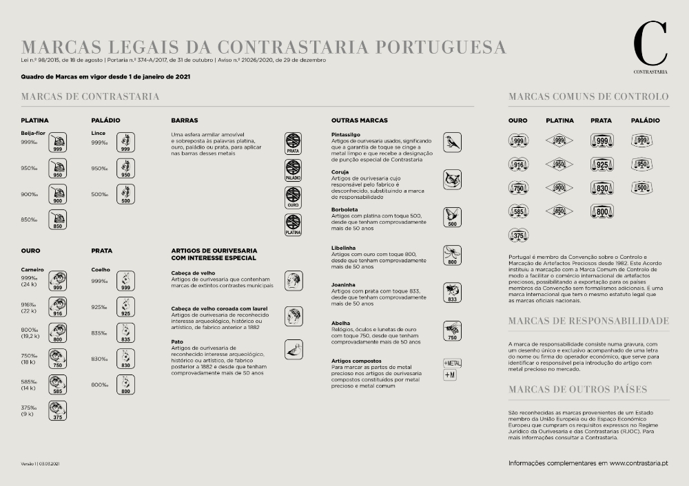 Disponibilizamos também o quadro das marcas da contrastaria de modelo oficial, emitido pela INCM, assim como o n/ número do Titulo de actividade Retalhista de Ourivesaria-Site T7273, conforme a lei exige.